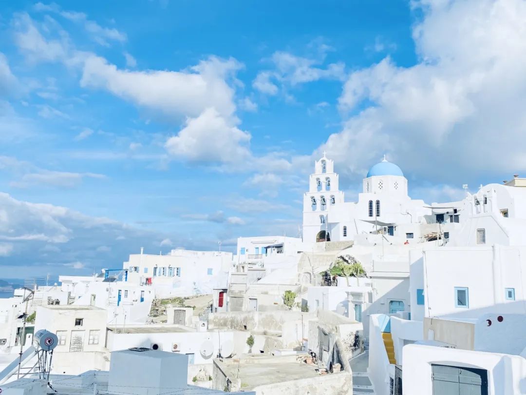 沒有誰能抵擋得住地中海溫暖的陽光和風(fēng)的柔情;也沒有誰能對抗得了愛琴海呢喃的愛語蜜意;更沒有誰想要去抓住圣托里尼島上徐徐流淌的光陰。為何能浪漫至此?因?yàn)檫@里是愛神“丘比特”的故鄉(xiāng),“柏拉圖式愛情”也孕育于這片土壤。在這里,如果愛情有顏色,那一定是藍(lán)白色,藍(lán)色與白色的擁吻,激發(fā)出圣托里尼島的旖旎風(fēng)光,藍(lán)得深邃,白得純粹。這里拿起手機(jī)你就能成為攝影師,是柏拉圖筆下的自由之地,是人們夢想中的度假勝地,它擁有最壯闊的海景,最美麗的日落余暉,最迷人的白墻藍(lán)頂教堂......我想,這就是人們向往的愜意生活,圣托里尼的浪漫將深深刻在心中。