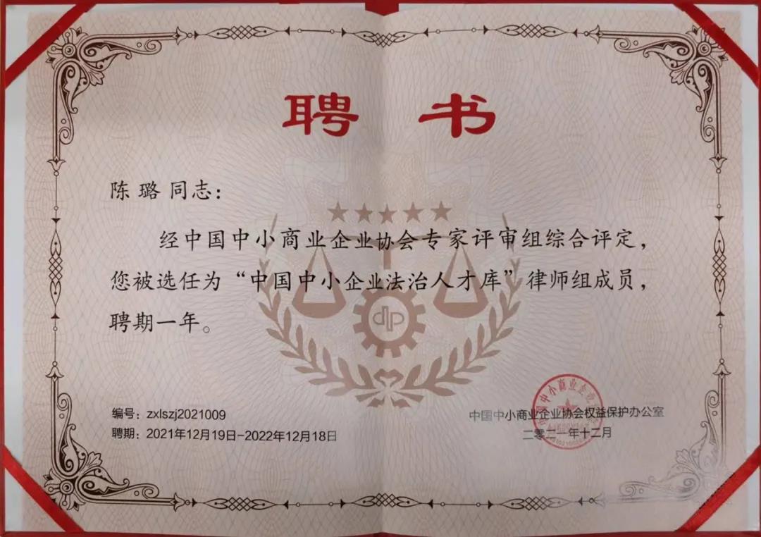 2021年12月14日,中國中小商業(yè)企業(yè)協(xié)會(huì)公示“中國中小企業(yè)法治人才庫”名單,神州英才首席法律顧問陳璐律師入選在列。 此次征選由中國中小商業(yè)企業(yè)協(xié)會(huì)發(fā)起,是在深入學(xué)習(xí)貫徹習(xí)近平法治思想,應(yīng)對現(xiàn)階段中小微企業(yè)的法治營商環(huán)境及法律服務(wù)需求,適應(yīng)《民法典》頒布帶來的系列法律變化,維護(hù)中小企業(yè)及企業(yè)家的合法權(quán)益,依法平等保護(hù)各類企業(yè)合法權(quán)益,為中小企業(yè)發(fā)展?fàn)I造良好的法治環(huán)境的大背景下,由中國中小商業(yè)企業(yè)協(xié)會(huì)在全國范圍內(nèi)征選優(yōu)秀法學(xué)法律專家加入“中國中小企業(yè)法治人才庫”。