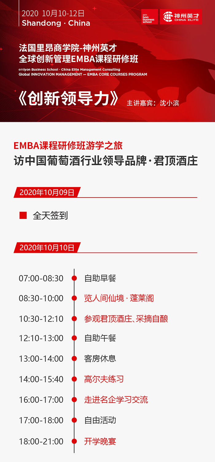 2020年10月10-12日,全球創(chuàng)新管理EMBA課程研修班游學(xué)之旅,將"走進(jìn)名企——訪中國葡萄酒行業(yè)領(lǐng)導(dǎo)品牌·君頂酒莊”,課程歷時3天,涵蓋名企交流、課程學(xué)習(xí),體驗(yàn)創(chuàng)新等。