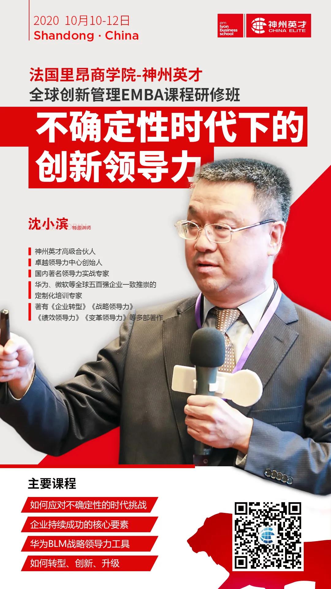 用全球視野創(chuàng)變未來,用創(chuàng)新驅(qū)動持續(xù)發(fā)展。神州英才高級合伙人、國內(nèi)著名領(lǐng)導(dǎo)力實(shí)戰(zhàn)專家——沈小濱老師,卓越領(lǐng)導(dǎo)力中心創(chuàng)始人,華為、微軟等全球500強(qiáng)企業(yè)一直推崇的定制化培訓(xùn)專家,《企業(yè)轉(zhuǎn)型》、《戰(zhàn)略領(lǐng)導(dǎo)力》等多部領(lǐng)導(dǎo)力暢銷書作者。10月11日-12日,將連續(xù)兩天與您分享《不確定時代下的創(chuàng)新領(lǐng)導(dǎo)力》 課程,學(xué)習(xí)如何應(yīng)對不確定性時代的挑戰(zhàn),剖析企業(yè)持續(xù)成功的核心要素,揭秘華為BLM戰(zhàn)略領(lǐng)導(dǎo)力工具,與您共同探討企業(yè)的轉(zhuǎn)型創(chuàng)新升級之路。教學(xué)相長,互助共贏,親愛的同學(xué)們,讓我們共同開啟一份值得回憶的相互學(xué)習(xí)的時光、共同進(jìn)步的時光、結(jié)伴成長的時光,共同成就的時光。